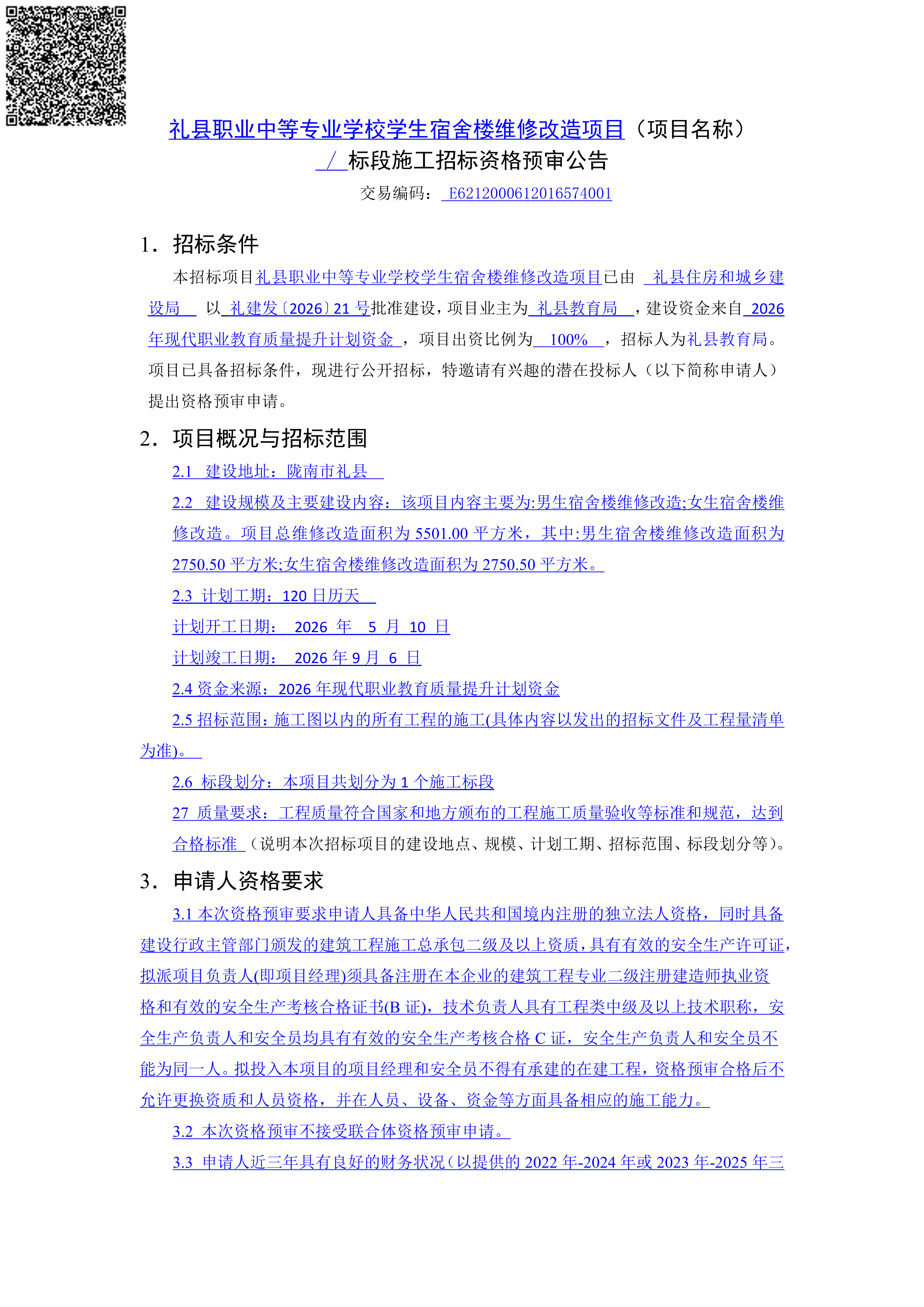礼县职业中等专业学校学生宿舍楼维修改造项目施工招标资格预审公告