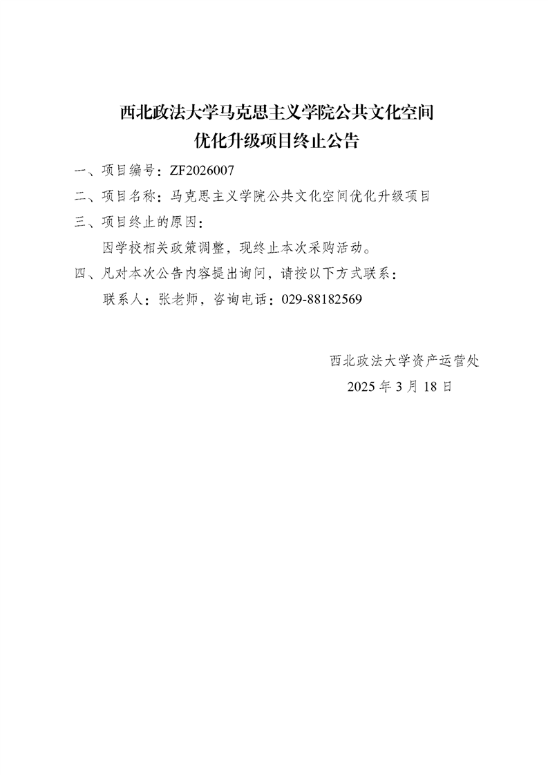 西北政法大学马克思主义学院公共文化空间优化升级项目终止公告