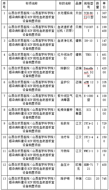 山西白求恩医院(山西医学科学院)感染病科建设HIV阳性血液透析室设备购置项目结果公告