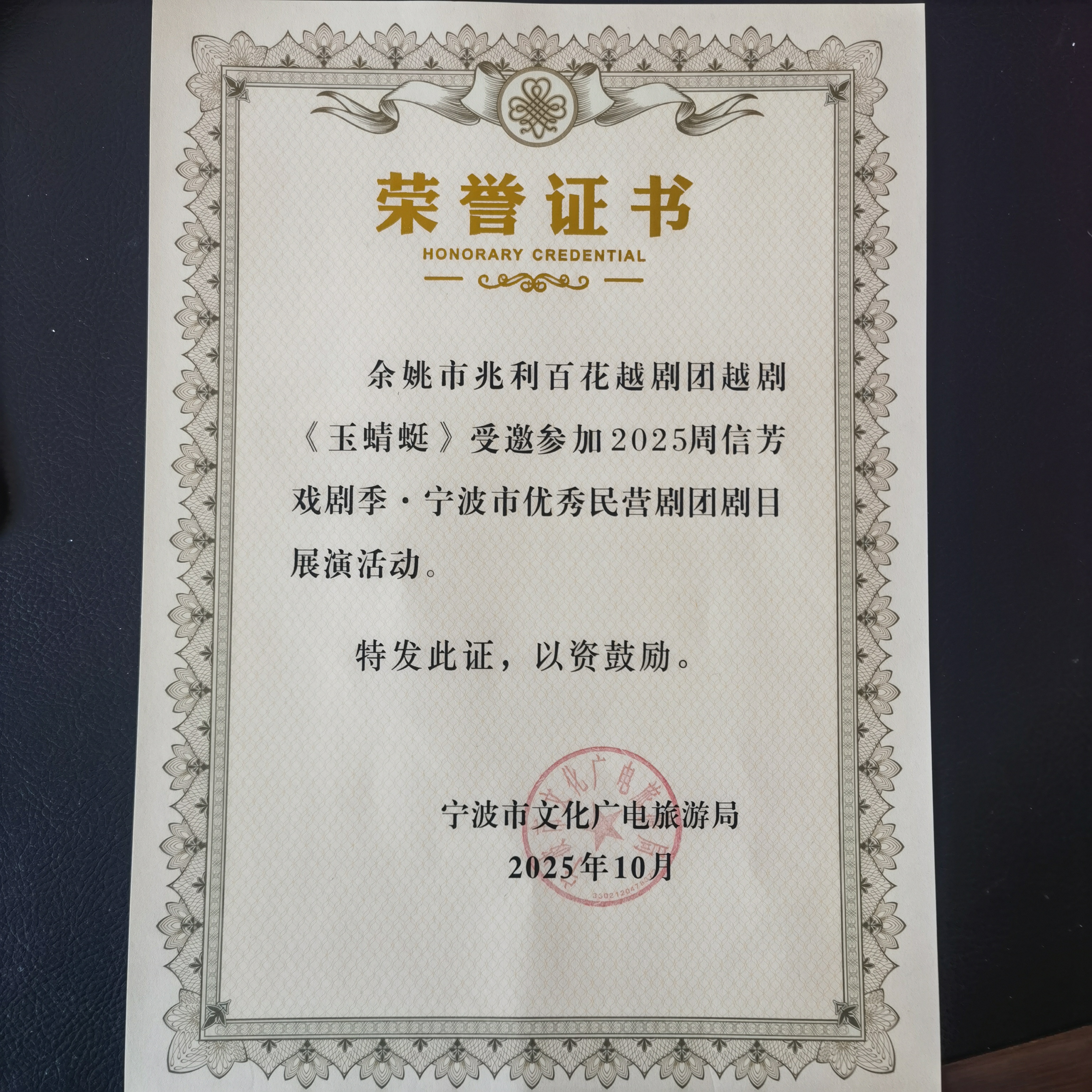 剧目荣获设区市奖项:****.**月受邀在宁波邵逸夫剧院参加****周信芳戏剧季宁波市优秀民营剧团展演活动.