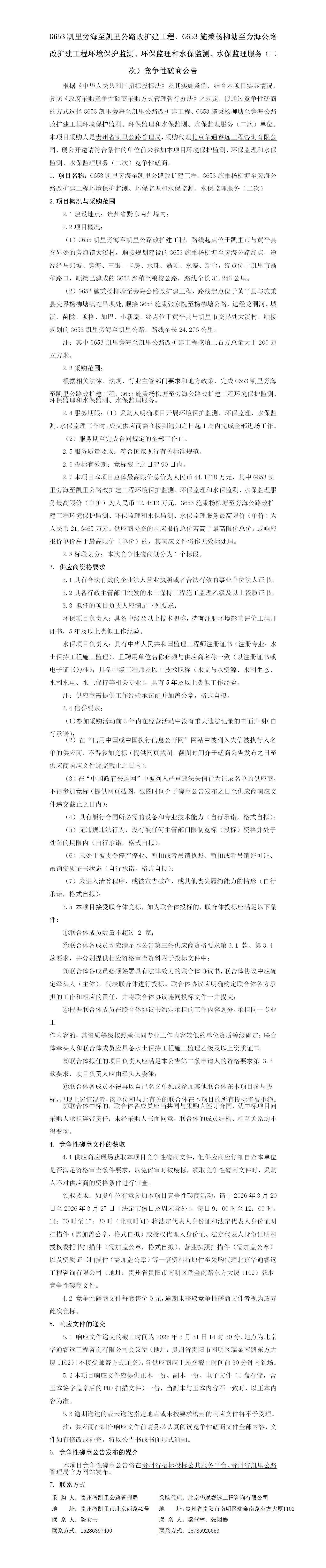 G653凯里旁海至凯里公路改扩建工程、G653施秉杨柳塘至旁海公路改扩建工程环境保护监测、环保监理和水保监测、水保监理服务(二次)竞争性磋商公告