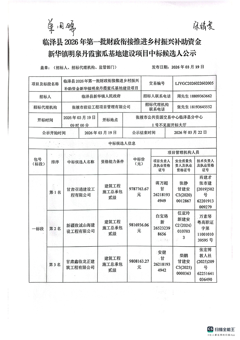 [临泽县]临泽县2026年第一批财政衔接推进乡村振兴补助资金新华镇明泉丹霞蜜瓜基地建设项目中标候选人公示[交易结果公示]