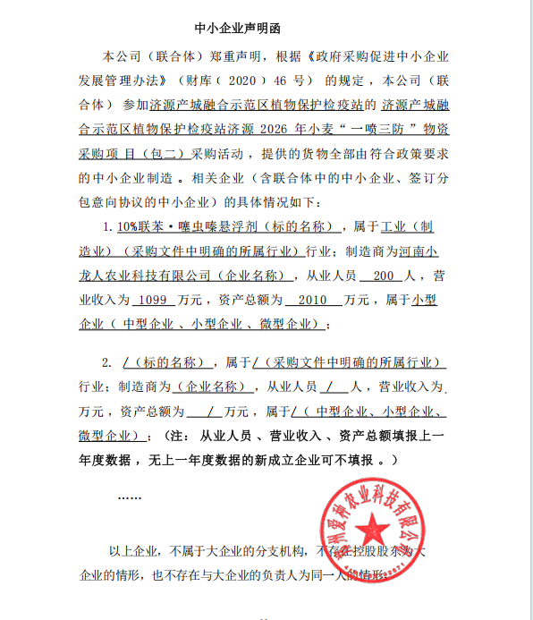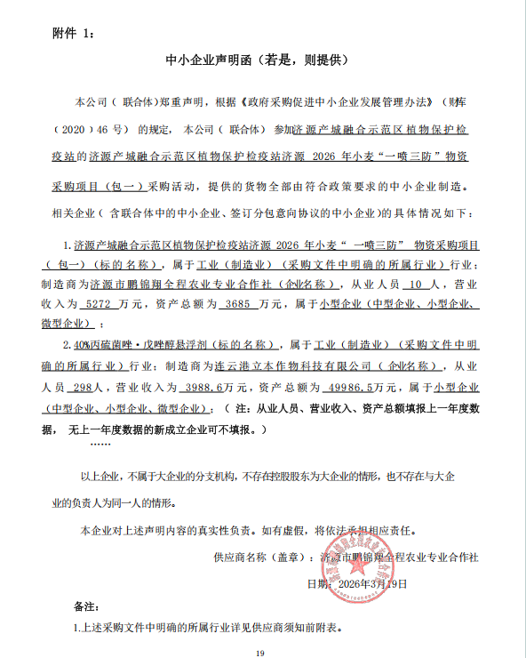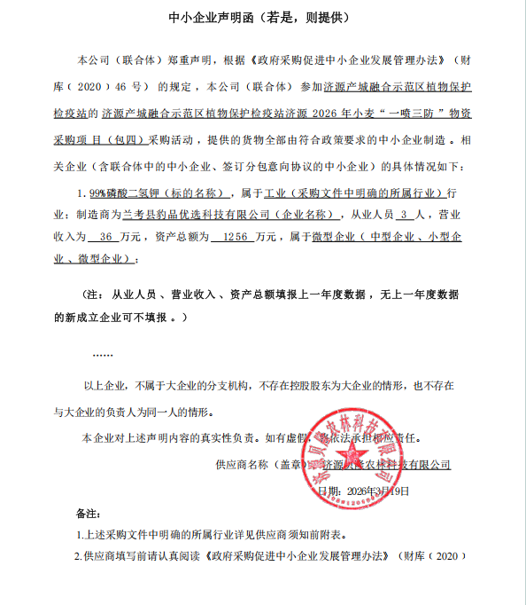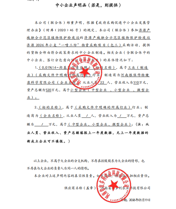 济源产城融合示范区植物保护检疫站济源2026年小麦“一喷三防”物资采购项目-成交公告