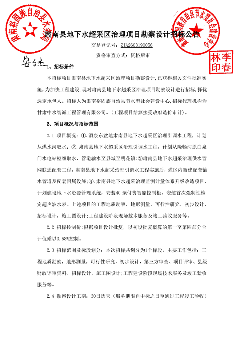 肃南县地下水超采区治理项目勘察设计[招标/资审公告]