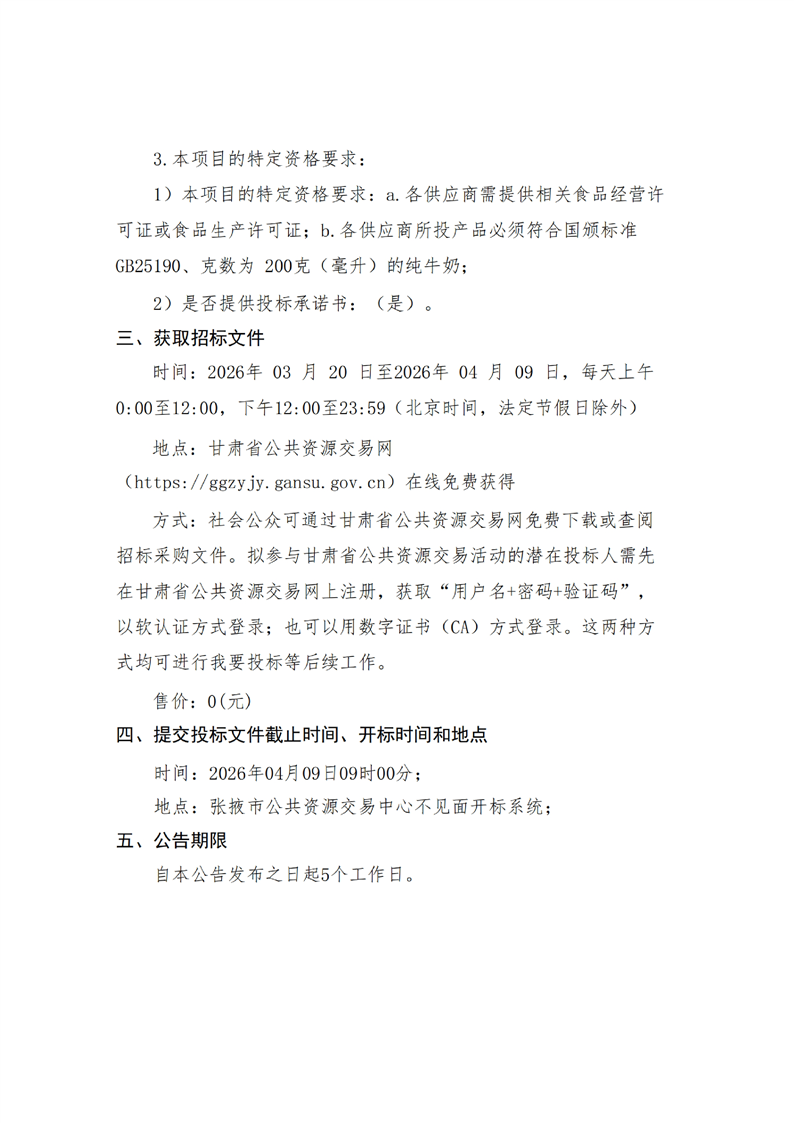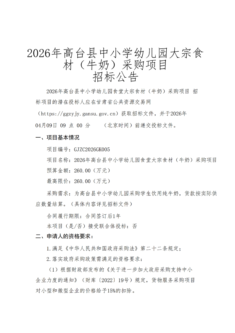 2026年高台县中小学幼儿园食堂大宗食材(牛奶)采购项目公开招标公告[采购/资审公告]