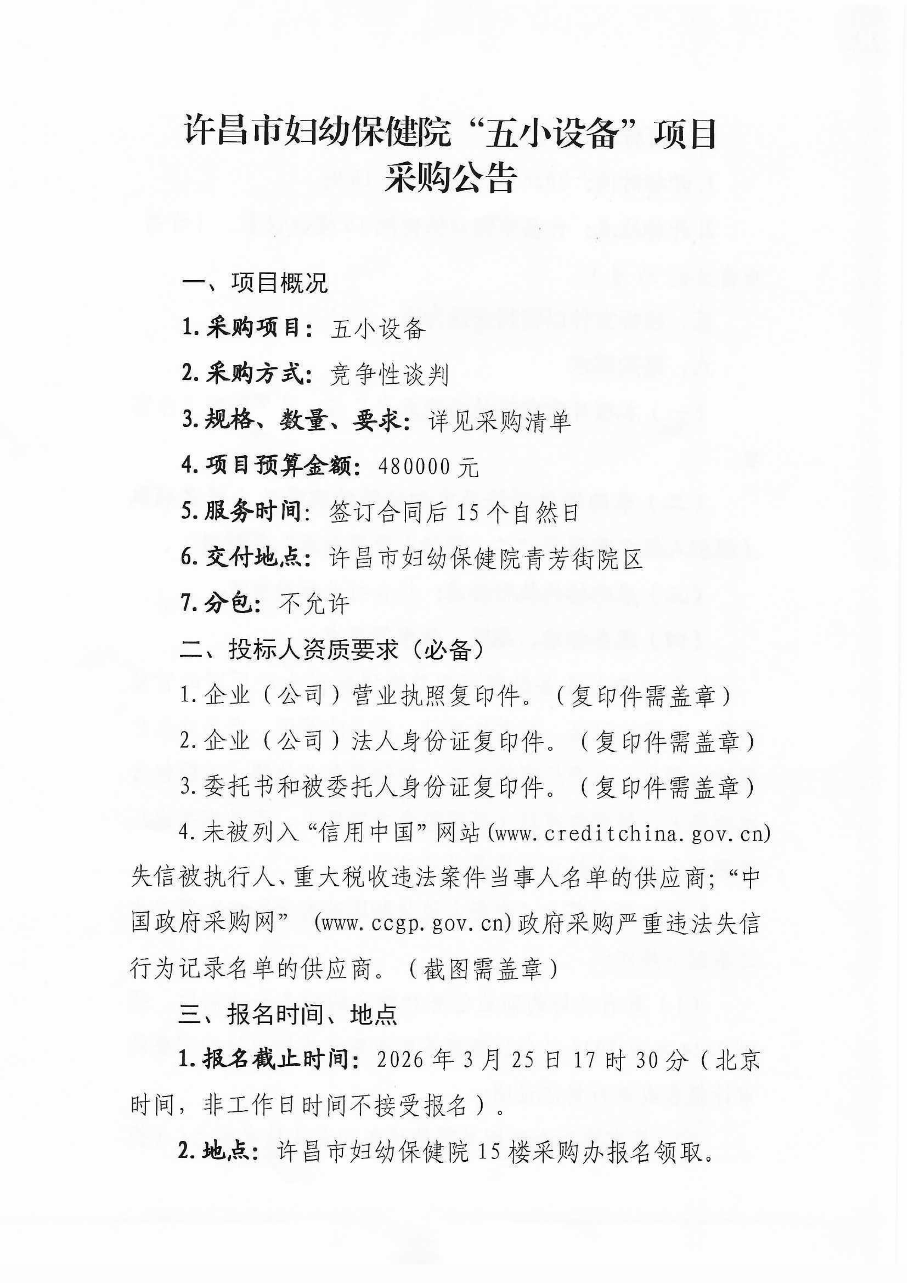 许昌市妇幼保健院“五小设备”项目采购公告