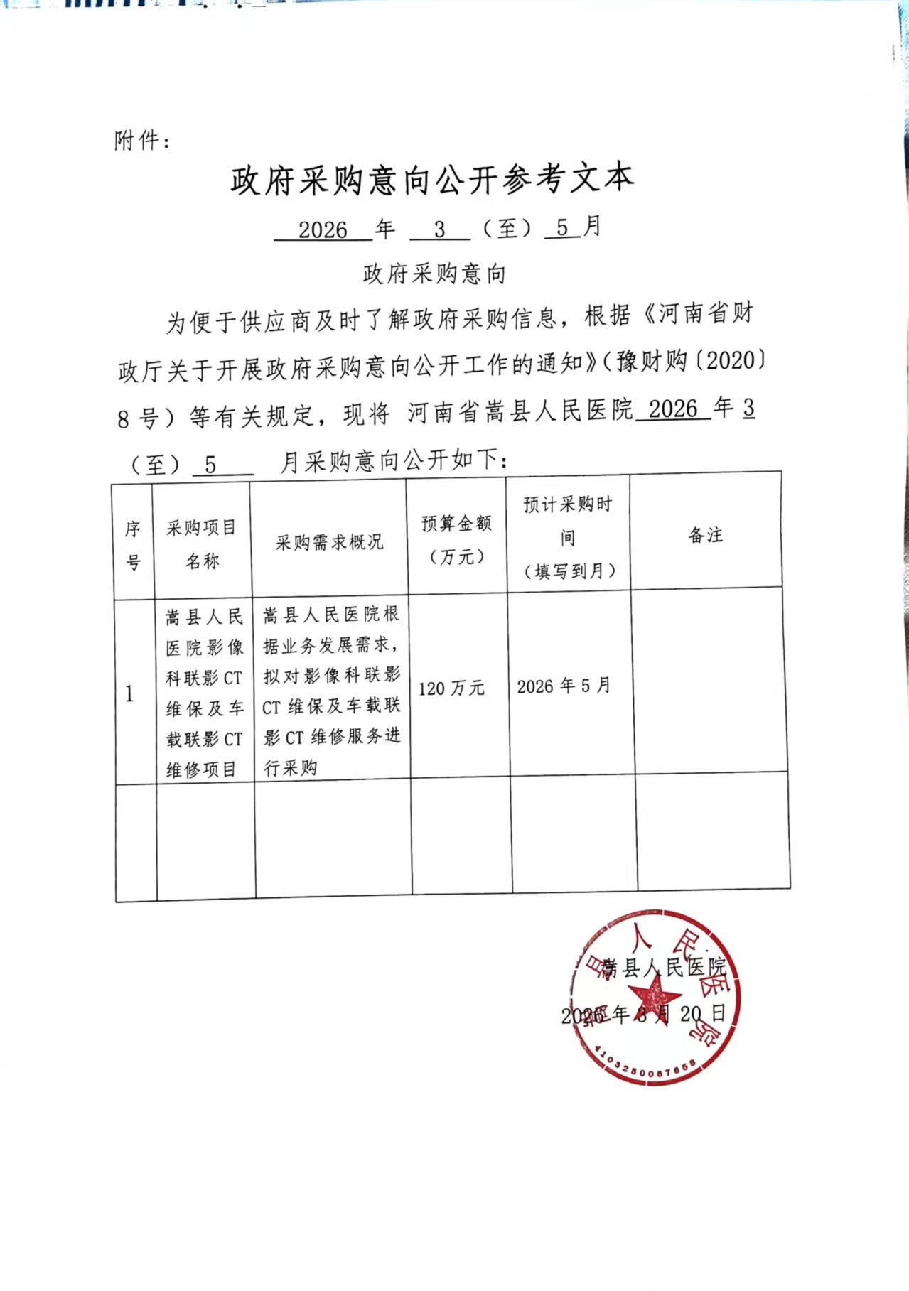 嵩县人民医院影像科联影CT维保及车载联影CT维修项目2026年3至5月政府采购意向