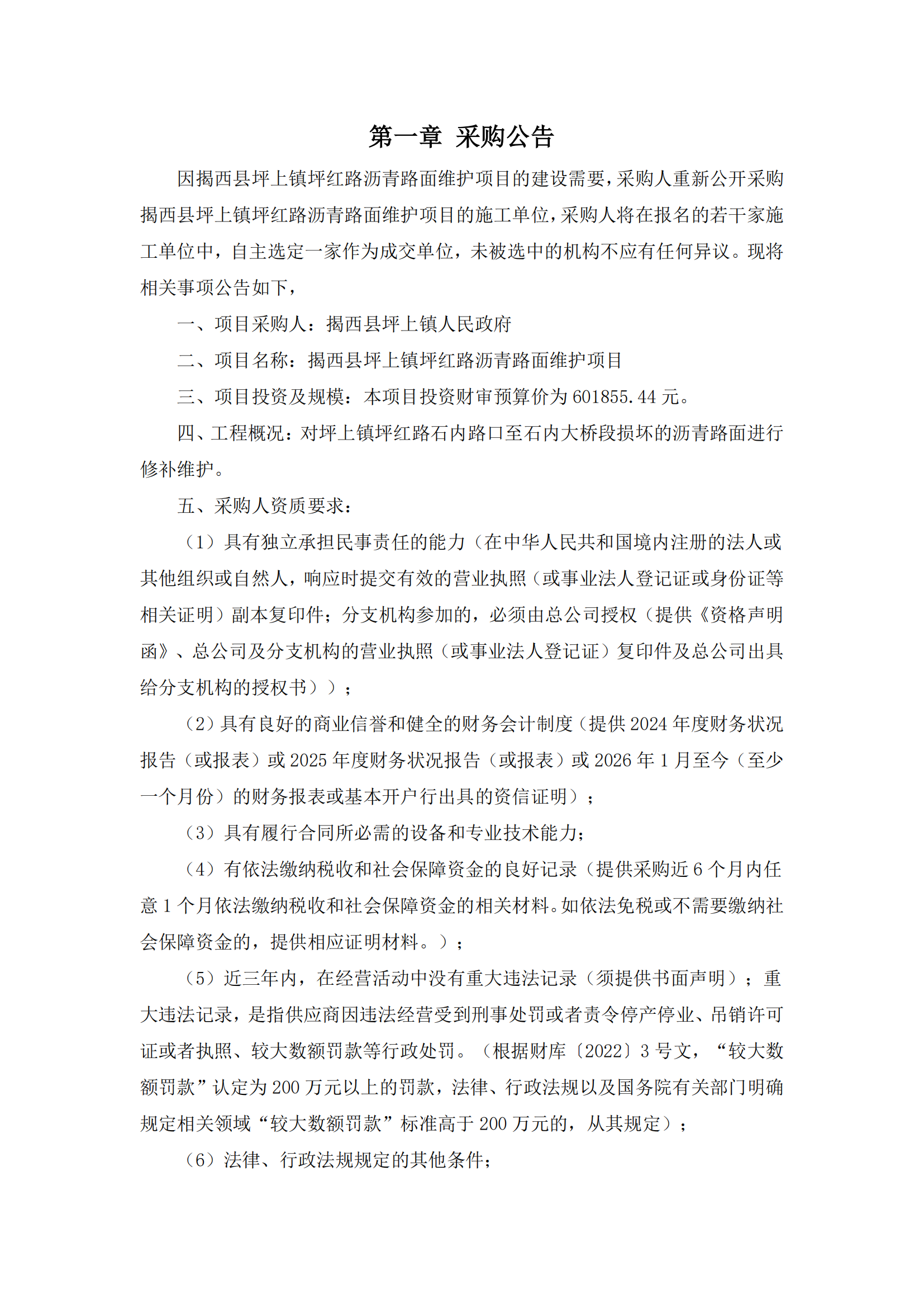 关于揭西县坪上镇坪红路沥青路面维护项目采购的公告
