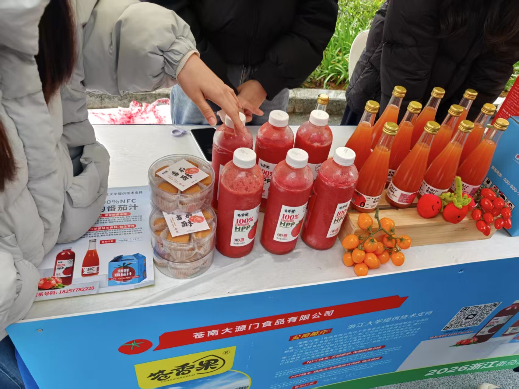 活动现场,**多家番茄育种科研单位、种子种苗企业、农机农资企业集中亮相,优秀番茄品种琳琅满目,番茄加工产品免费品鉴,番茄嫁接机、智能采摘设备等新农机逐一展示,苍南各乡镇特色农产品同步展销,吸引众多参会人员驻足咨询。其中,苍南大源门食品有限公司推出的***番茄汁、番茄饼干等加工产品备受参会嘉宾青睐。该公司****年采购番茄约***吨,饮料板块产值达*、*百万元,其中番茄汁销售额近**万元,通过精深加工,大幅提升番茄附加值,让小番茄实现价值最大化。
