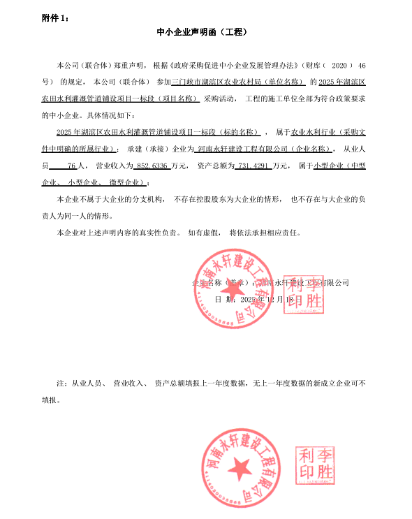 三门峡市湖滨区农业农村局2025年湖滨区农田水利灌溉管道铺设项目-成交公告