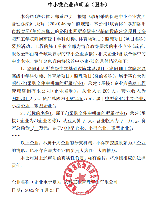 洛阳市教育局四所高级中学基础设施建设(洛阳理工学院附属高级中学科创楼、体育场)监理项目-中标公告