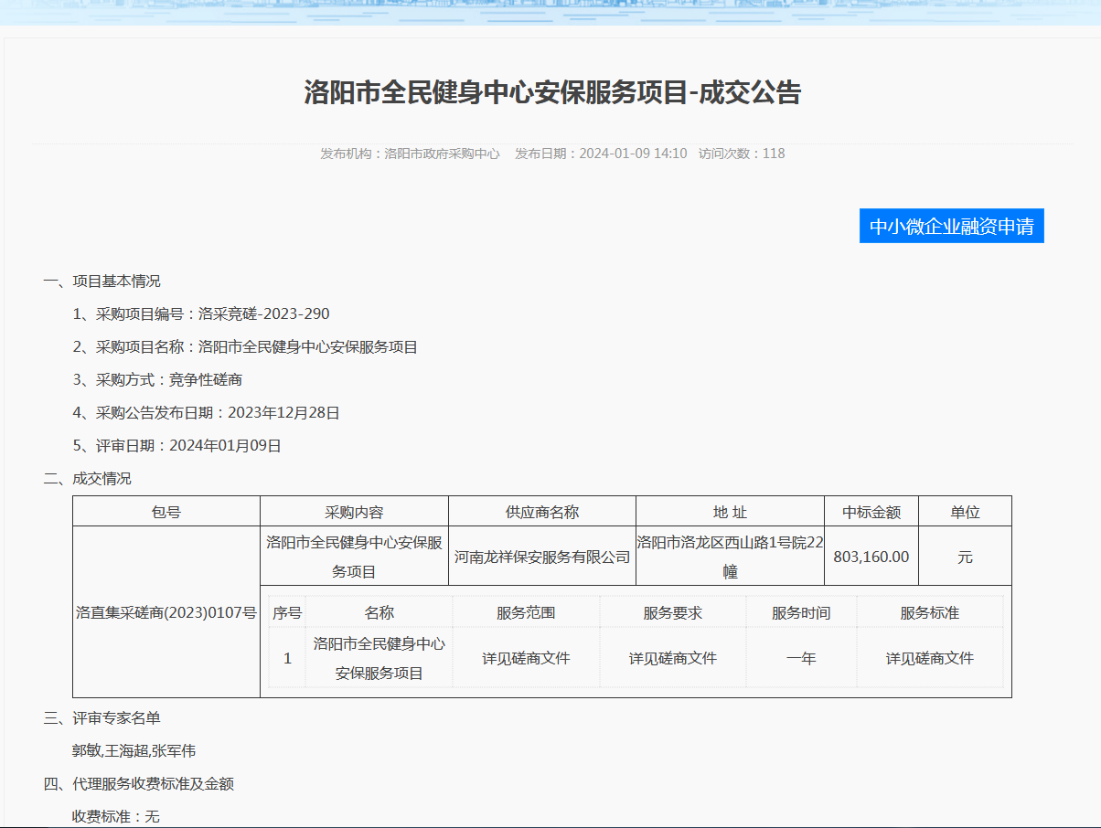 洛阳市全民健身中心安保服务项目-成交公告