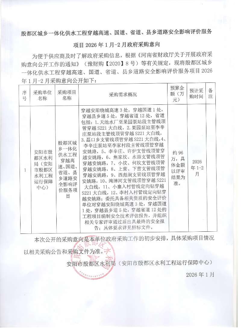 安阳市殷都区水利局(安阳市殷都区水利工程运行保障中心)2026年1至2月政府采购意向