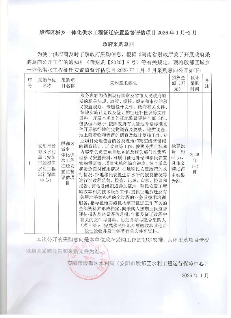 安阳市殷都区水利局(安阳市殷都区水利工程运行保障中心)2026年1至2月政府采购意向
