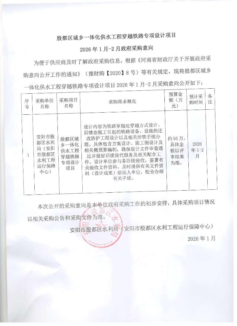 安阳市殷都区水利局(安阳市殷都区水利工程运行保障中心)2026年1至2月政府采购意向