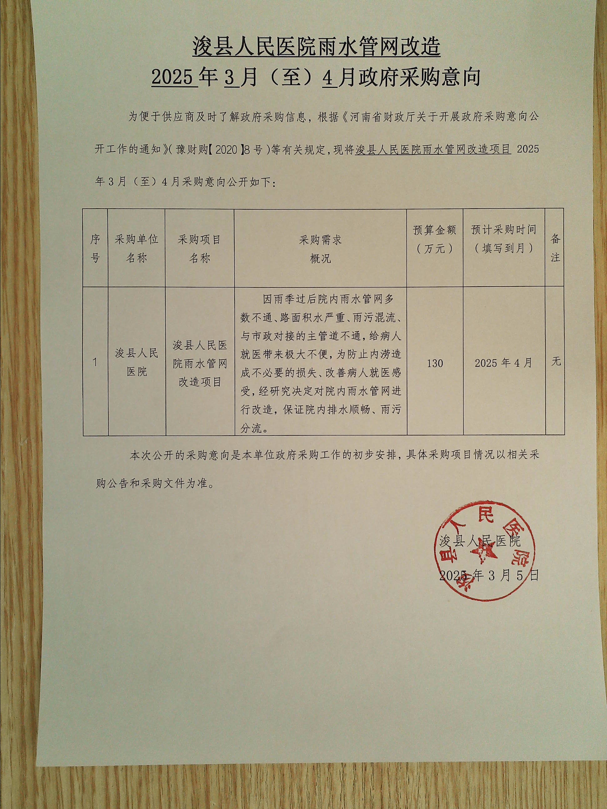 为便于供应商及时了解政府采购信息,根据《河南省财政厅关于开展政府采购意向公开工作的通知》(豫财购〔****〕*号)等有关规定,现将浚县人民医院 ****年*(至)*月采购意向公开如下: |