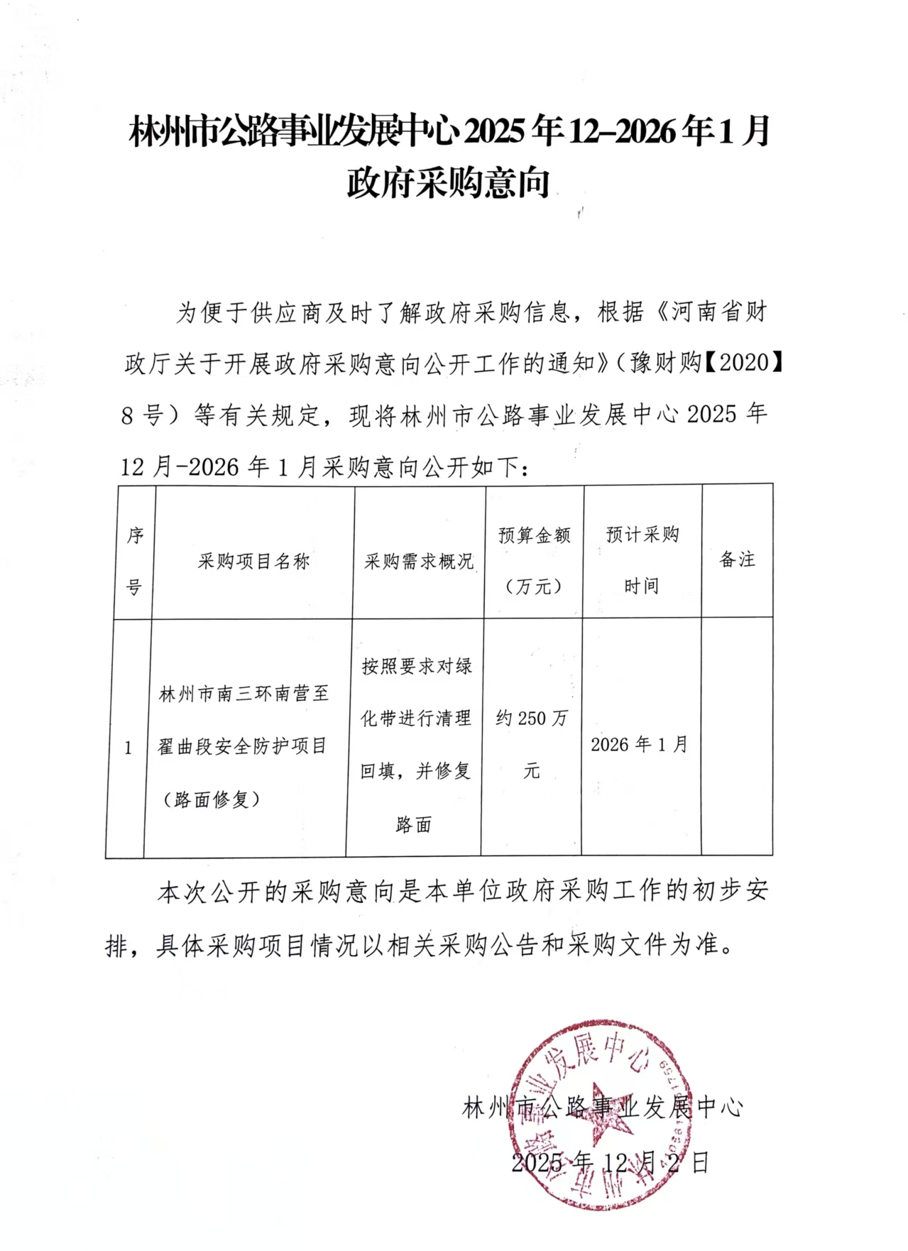 林州市公路事业发展中心2026年1月政府采购意向