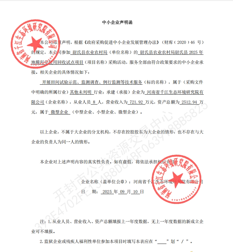 尉氏县农业农村局尉氏县2025年地膜科学使用回收试点项目二包段-中标公告