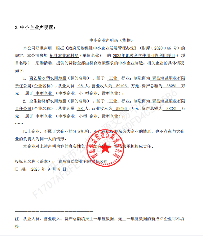 | *、采购范围:采购《聚乙烯吹塑农用地膜》(************)*.***毫米***吨、《全生物质降解农用地膜》(**/* **********)*.***毫米**吨。 *、资金来源及落实情况:财政资金,已落实; *、供货期限:合同签订后**天 *、质保期:合格,符合国家及行业相关标准及要求; *、交货地点:采购人指定地点; *、质量要求:合格,符合国家及行业相关标准及要求,并满足采购人的相关要求; | |||||||||||||||||||||||||||||||||||||