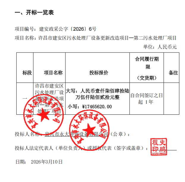 建安政采公字〔2026〕6号许昌市建安区住房和城乡建设局许昌市建安区污水处理厂设备更新改造项目-第二污水处理厂项目-中标公告