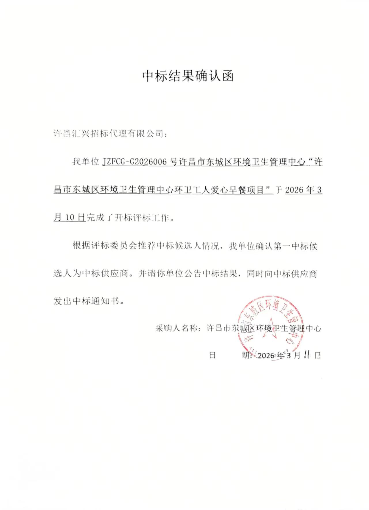 JZFCG-G2026006号许昌市东城区环境卫生管理中心“许昌市东城区环境卫生管理中心环卫工人爱心早餐项目”-中标公告