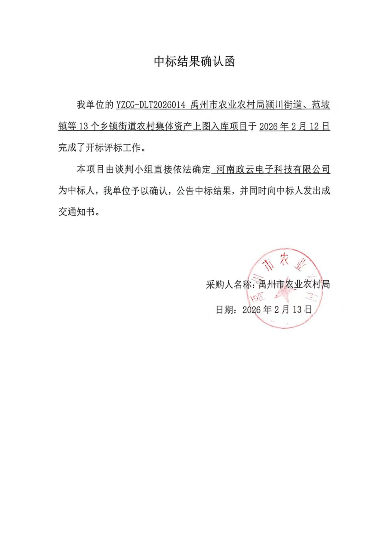 YZCG-DLT2026014禹州市农业农村局颍川街道、范坡镇等13个乡镇街道农村集体资产上图入库项目-成交公告