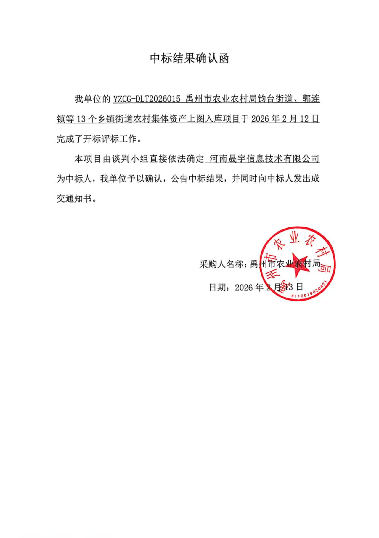 YZCG-DLT2026015禹州市农业农村局钧台街道、郭连镇等13个乡镇街道农村集体资产上图入库项目-成交公告