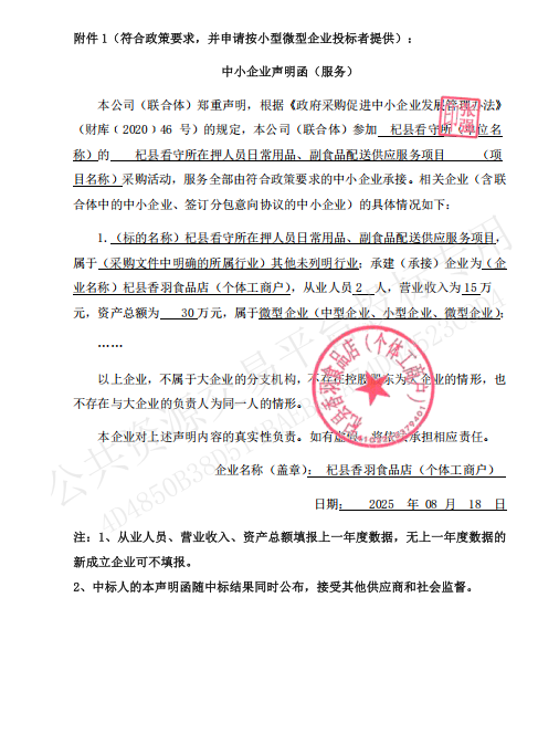 | *、资金来源:在押人员自有资金 *、服务内容:杞县看守所在押人员日常用品、副食品配送供应服务,中标供应商独立经营、自负盈亏,合同到期后视履约期间服务情况决定是否续签合同或重新招标。 *、服务地点:采购(招标)人指定地点 *、服务期限:自合同签订之日起*年(每季度至少抽取***人以上进行满意度调查,全年满意率综合未达到**%,我方有权终止合同。) *、质量要求:合格,满足采购人需求 | |||||||||||||||||||||||||||||||