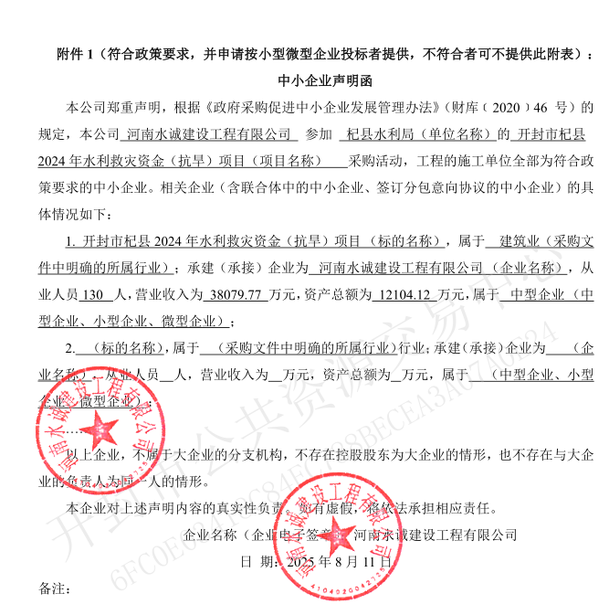 开封市杞县2024年水利救灾资金(抗旱)项目第1标段成交结果公告