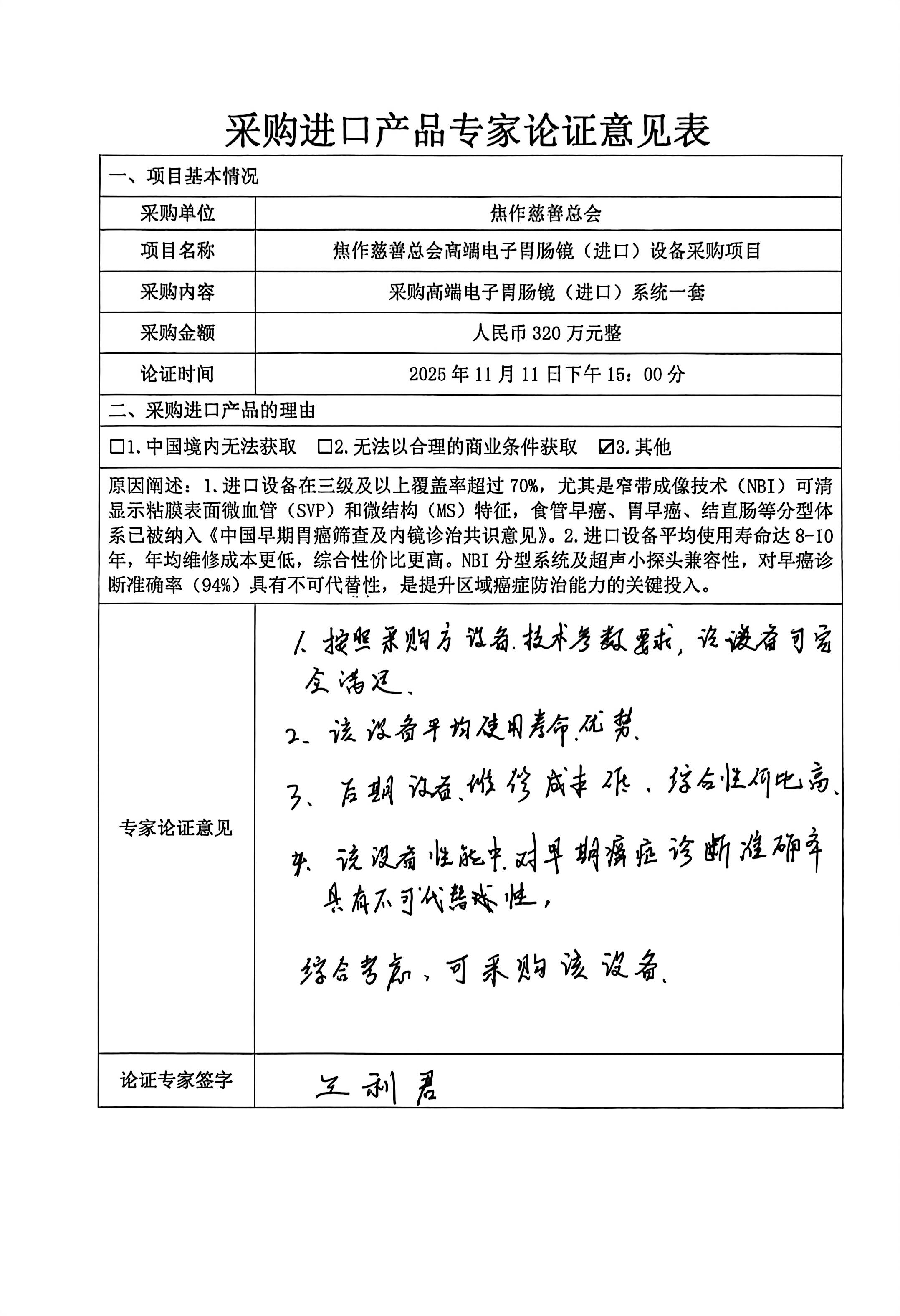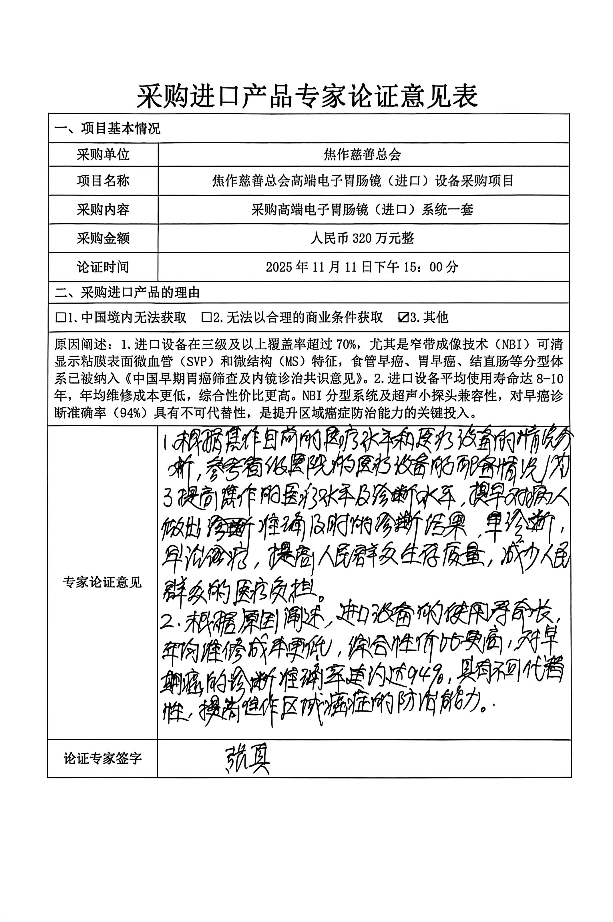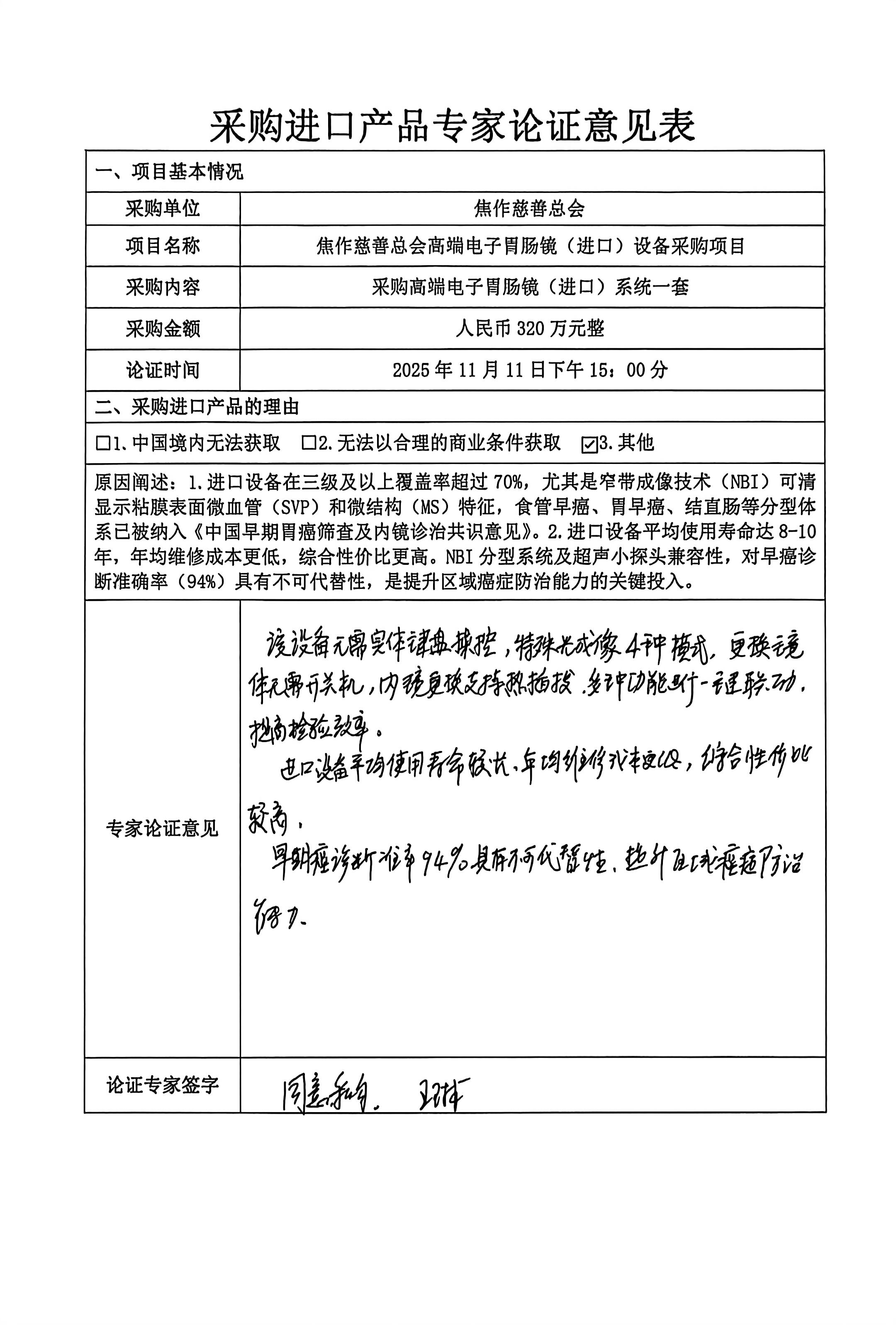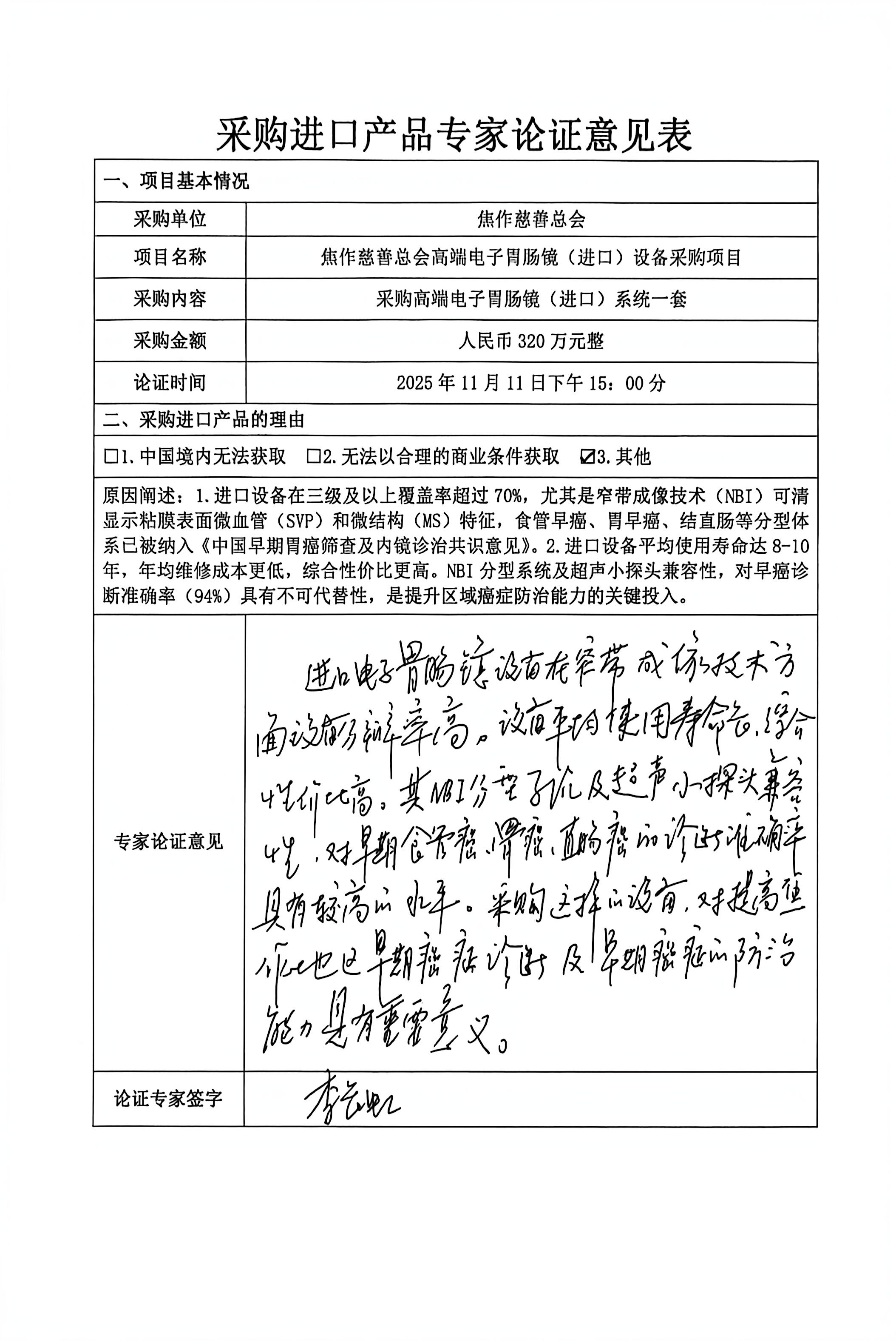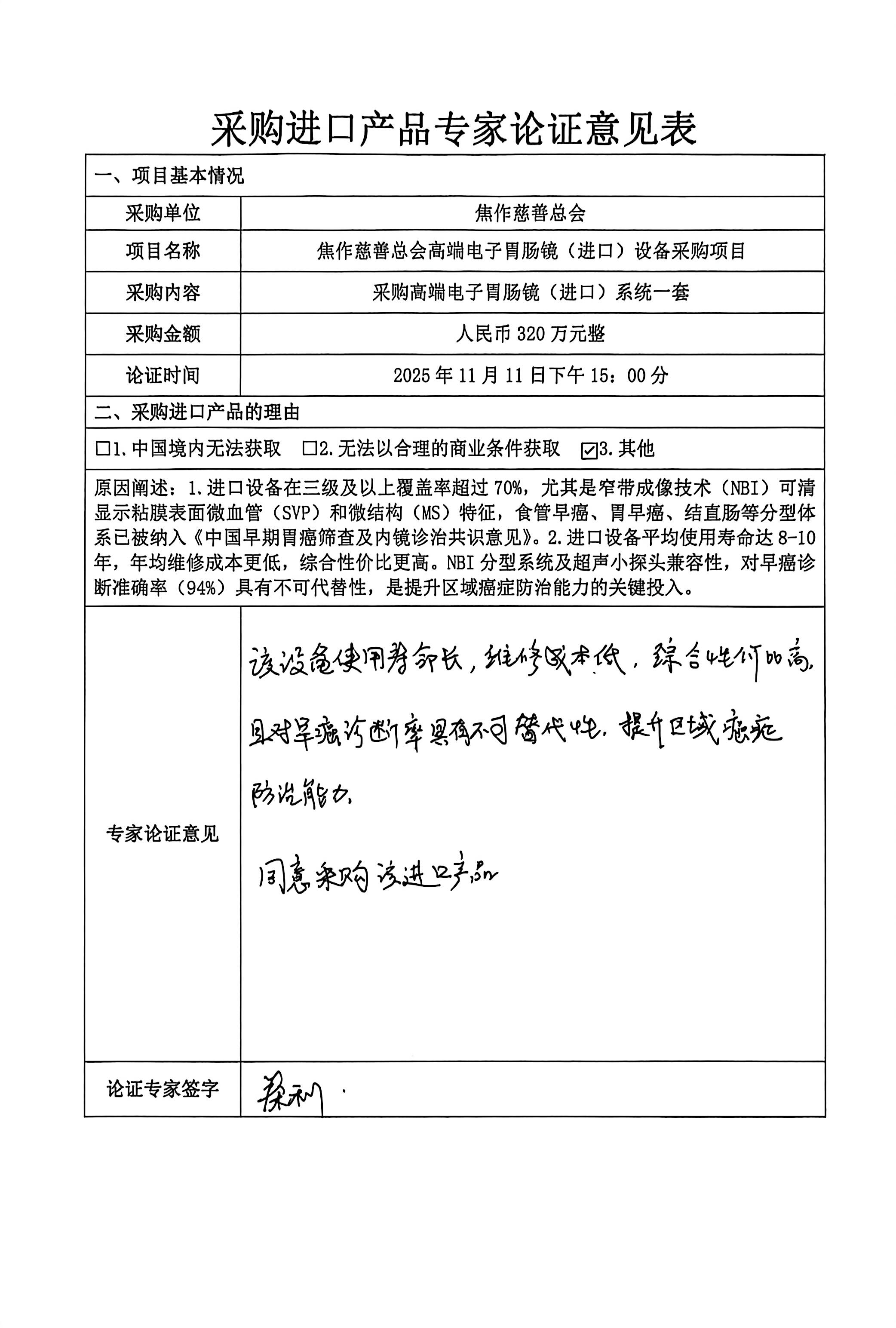 | 本项目非单一来源采购,拟采购进口产品。 申请进口产品理由: *.进口设备在三级及以上覆盖率超过**%,尤其是窄带成像技术(***)可清显示粘膜表面微血管(***)和微结构(**)特征,食管早癌、胃早癌、结直肠等分型体系已被纳入《中国早期胃癌筛查及内镜诊治共识意见》。 *.进口设备平均使用寿命达****年,年均维修成本更低,综合性价比更高。***分型系统及超声小探头兼容性,对早癌诊断准确率(**%)具有不可代替性,是提升区域癌症防治能力的关键投入。 | ||||||||||||||||||||||||