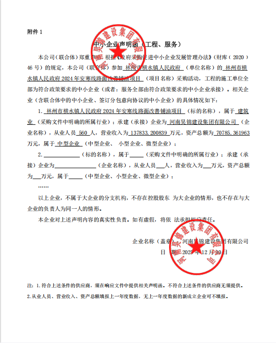 林州市横水镇人民政府2024年安寒线路面改善铺油项目-成交公告
