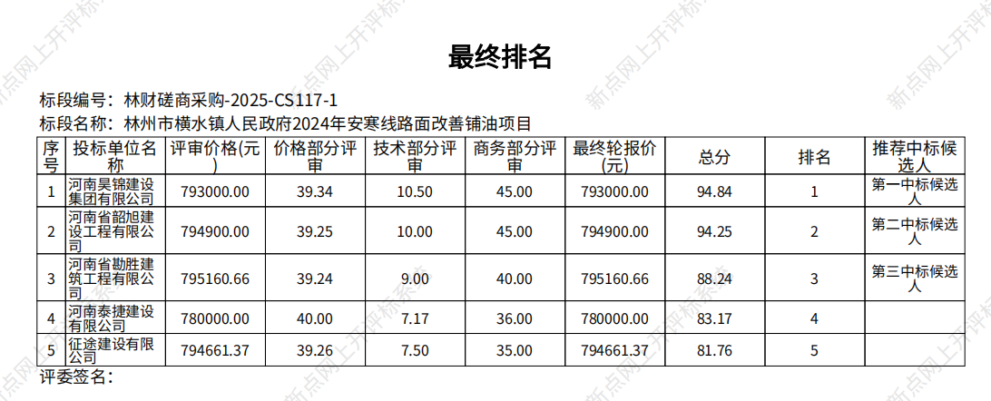 | 评标结果如下: 第一中标候选供应商:河南昊锦建设集团有限公司技术和商务:**.**分,价格:**.**分,总分:**.**分;第二中标候选供应商:河南省韶旭建设工程有限公司技术和商务:**.**分,价格:**.**分,总分:**.**分;第三中标候选供应商:河南省勘胜建筑工程有限公司技术和商务:**.**分,价格:**.**分,总分:**.**分;其他投标单位:河南泰捷建设有限公司总得分:**.**分;征途建设有限公司总得分:**.**分 ;废标情况:无。 各有关当事人对评标结果如有异议者,可以在公告结束之日起七个工作日内,以书面形式向采购人、采购代理机构提出质疑(加盖单位公章且法定代表人签字,并附带相应的证明材料),由法定代表人或其授权代表携带企业营业执照复印件(加盖公章)及授权委托书、本人身份证件(原件)一并提交(邮寄、邮件不予受理),并以质疑函接受确认日期作为受理时间。逾期未提交或未按照要求提交的质疑函将不予受理。 | |||||||||||||||||||||||||||||||