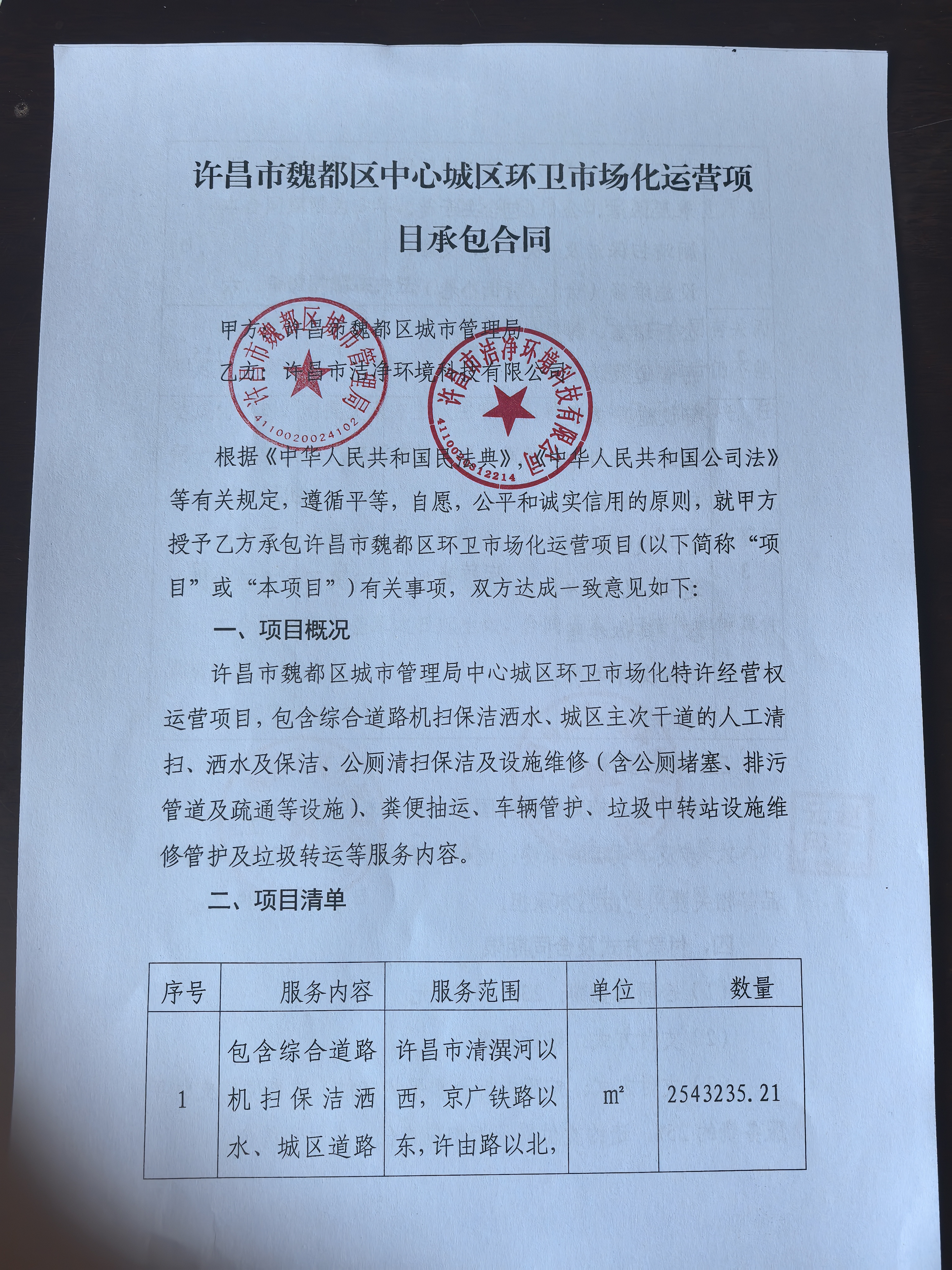 | 二、合同名称:许昌市魏都区城市管理局中心城区环卫市场化运营项目 | ||||||||||||