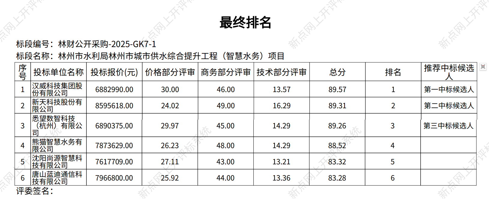 | *.评标结果如下:第一中标供应商:汉威科技集团股份有限公司,价格**.**分,商务**.**分,技术**.**分,总分**.**;第二中标候选供应商:新天科技股份有限公司,价格**.**分,商务**.**分,技术**.**分,总分**.**;第三中标候选供应商:悉望数智科技(杭州)有限公司,价格**.**分,商务**.**分,技术**.**分,总分**.**;其他供应商:熊猫智慧水务有限公司,价格**.**分,商务**.**分,技术**.**分,总分**.**;沈阳尚源智慧科技有限公司,价格**.**分,商务**.**分,技术**.**分,总分**.**;唐山蓝迪通信科技有限公司,价格**.**分,商务**.**分,技术**.**分,总分**.**。 *.废标情况:因字数限制详见附件。 *.供应商认为中标结果使自己的权益受到损害的,可以在中标结果公告期限届满之日起七个工作日内,按照《中华人民共和国政府采购法》、《中华人民共和国政府采购法实施条例》和《政府采购质疑和投诉办法》相关规定,以书面形式由法定代表人或其授权代表携带本人身份证件(原件和加盖公章的复印件)、质疑函原件(加盖公章及法定代表人或其授权代表签字)及相关证明材料向采购人和采购代理机构提出质疑(邮寄件、传真件不予受理),逾期将不再受理。 | |||||||||||||||||||||||||||||||