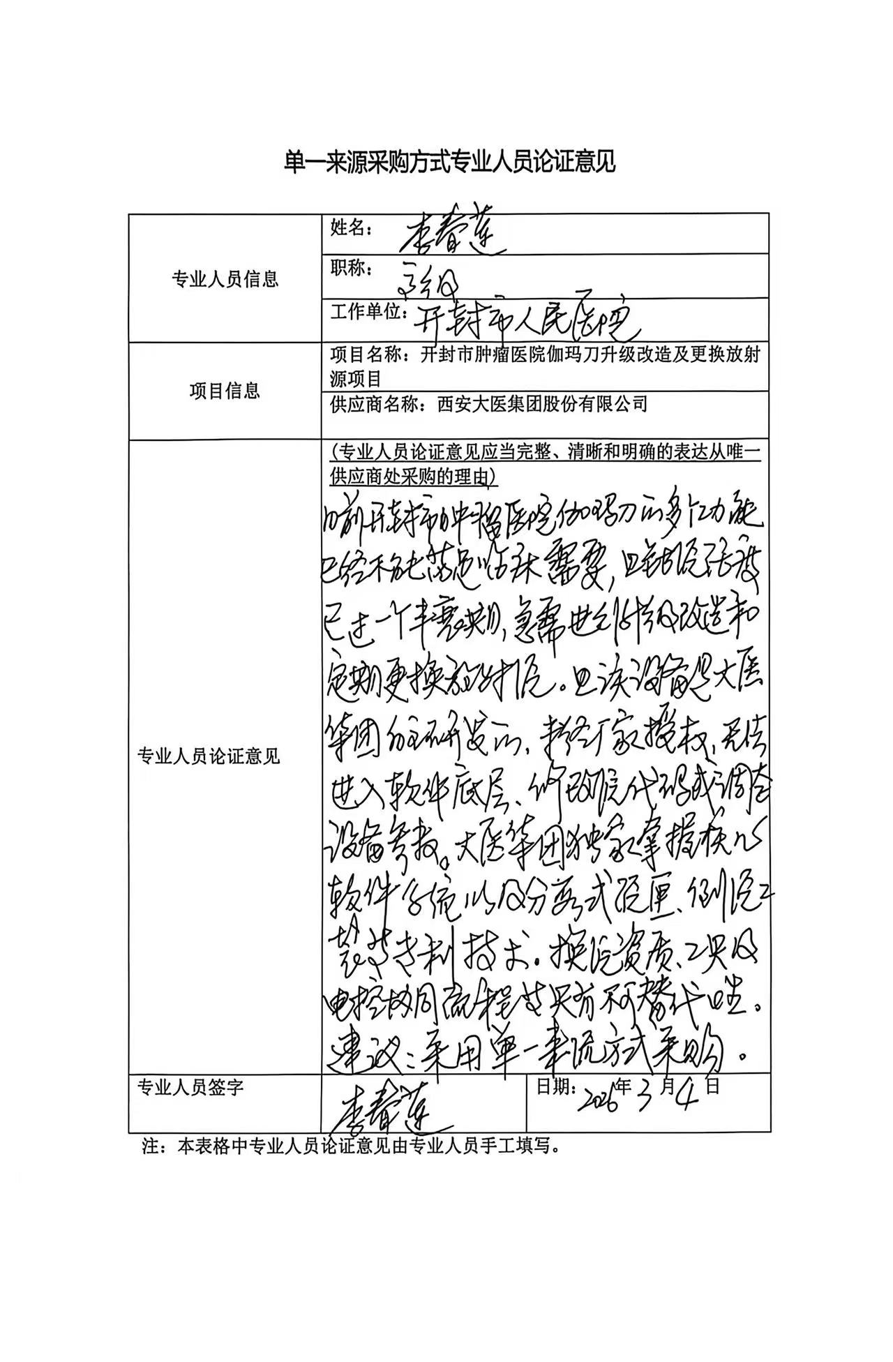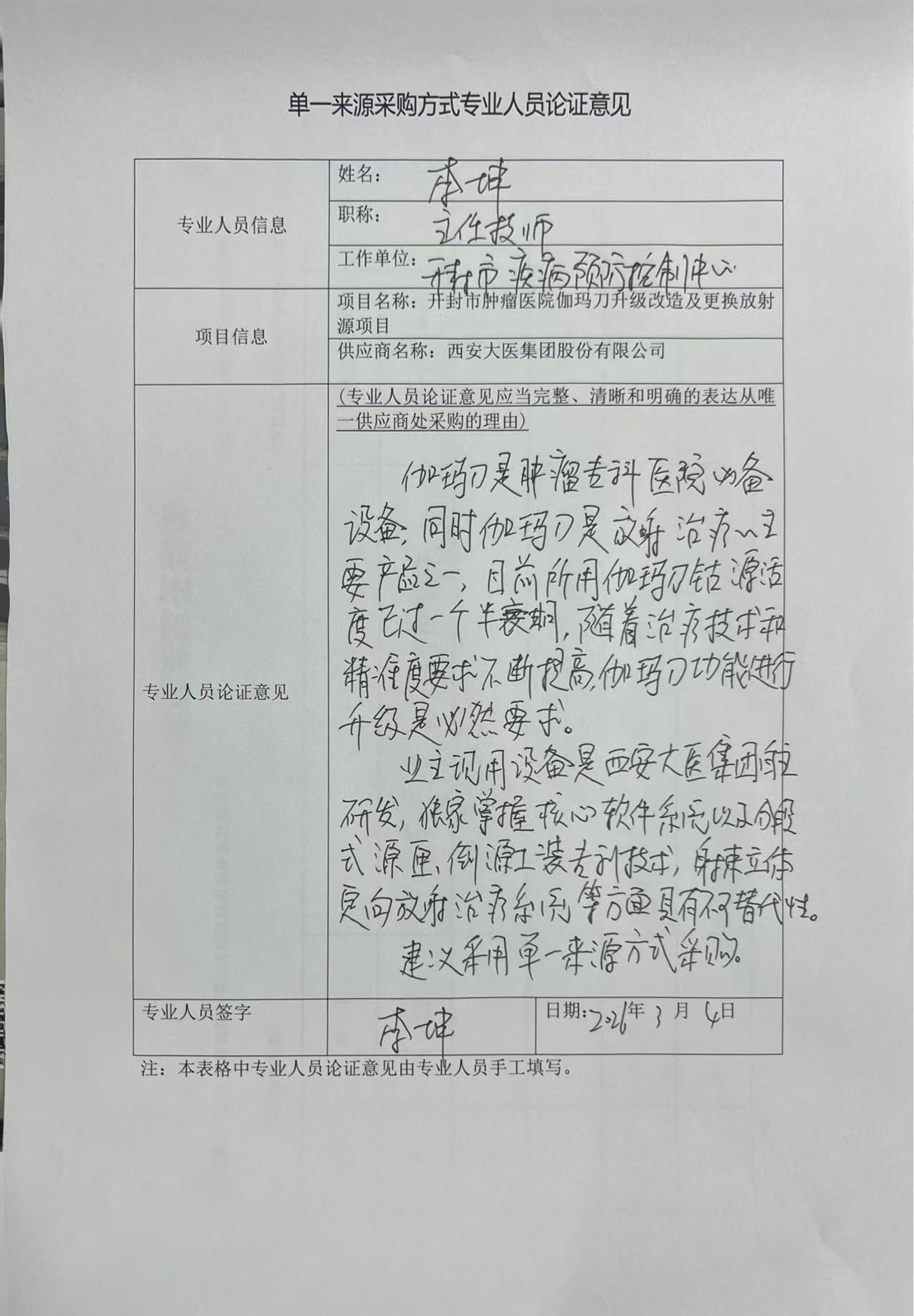 | 我院为肿瘤专科医院,放射治疗是肿瘤治疗的重要手段之一,伽玛刀是放射治疗设备的主要产品之一。它主要是利用钴***产生伽马射线,以病变组织为靶点,根据立体几何定向原理,形成窄束射线,一次性大剂量聚焦照射,使病变组织坏死,从而达到疾病治疗目的。我院伽玛射束立体定向放射治疗系统为头体一体伽玛刀,其临床使用更有优势。但我院伽玛刀设备为****年产品,其多个功能已不能满足临床需要,钴源活度也已过一个半衰期,升级改造和定期更换放射源是为了满足患者放射治疗的必然要求。 由于我院伽玛刀是西安大医集团股份有限公司自主研发的伽玛射束立体定向放射治疗系统,其上位机软件、下位机软件、***治疗计划系统等模块均获国家专利授权,未经厂家书面授权,任何第三方单位或个人均无法进入软件底层、修改源代码或调整设备参数,且西安大医集团股份有限公司作为设备制造商,独家掌握核心软件系统以及分段式源匣、倒源工装等专利技术。换源所需的资质、工具及电控协同流程均具有不可替代性;未经授权的操作可能导致事故。为了历史数据的完整性,业务系统的稳定及延续性。综合本项目的采购需求,依据《中华人民共和国政府采购法》第三十一条第一款规定。经论证拟推荐本项目采用单一来源方式进行采购。 | ||||||||||||||||
