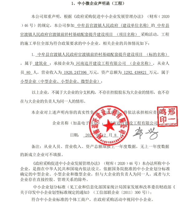中牟县官渡镇人民政府官渡镇前於村基础配套提升建设项目-成交公告