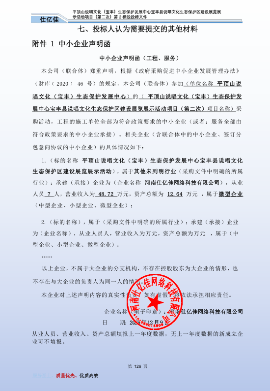 | *、采购内容: 第一标段:国家级说唱文化(宝丰)生态保护区建设成果交流展示活动,开展生态区建设及说唱文化保护成果相关的系列交流、展示活动;从而搭建交流平台,加强生态区间建设经验交流。 第二标段:国家级说唱文化(宝丰)生态保护区宣传推广,开展说唱文化(宝丰)生态区保护区相关活动的宣传推广,通过网络平台(抖音、百度、腾讯等)扩大说唱文化品牌影响力和知晓度,提高传承人和群众参与度,推进生态区高质量建设。 *、服务期限:第一标段,签订合同后在****年**月**日结束,完成相关成果。 第二标段,签订合同后在****年**月**日结束,完成相关成果。 *、质量要求:达到国家以及相关行业标准,且满足采购人要求。 *、服务地点:采购人指定地点。 *、标段划分:本项目划分两个标段。 *、合同履行期限:同服务期限。 *、本项目是否接受联合体投标:否 *、是否接受进口产品:否 *、是否专门面向中小企业:是 | |||||||||||||||||||||||||||||||||||||||||||||||||||||||