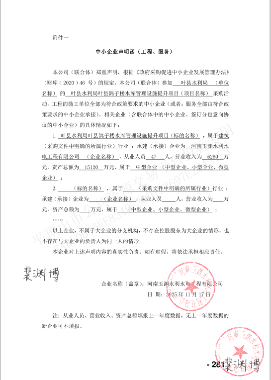 【平公资采20251068号】叶县水利局叶县鸽子楼水库管理设施提升项目—成交公告