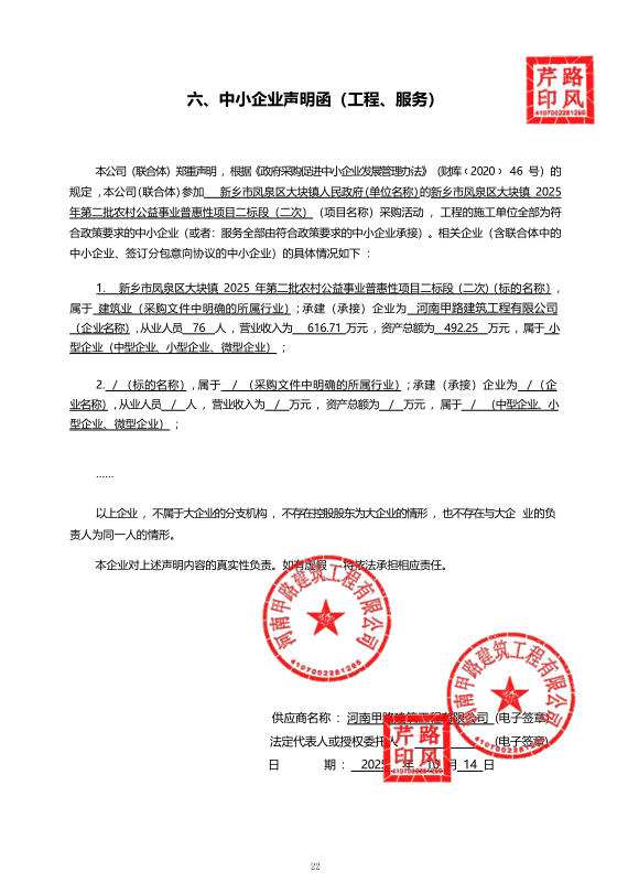 新乡市凤泉区大块镇2025年第二批农村公益事业普惠性项目二标段(二次)结果公告
