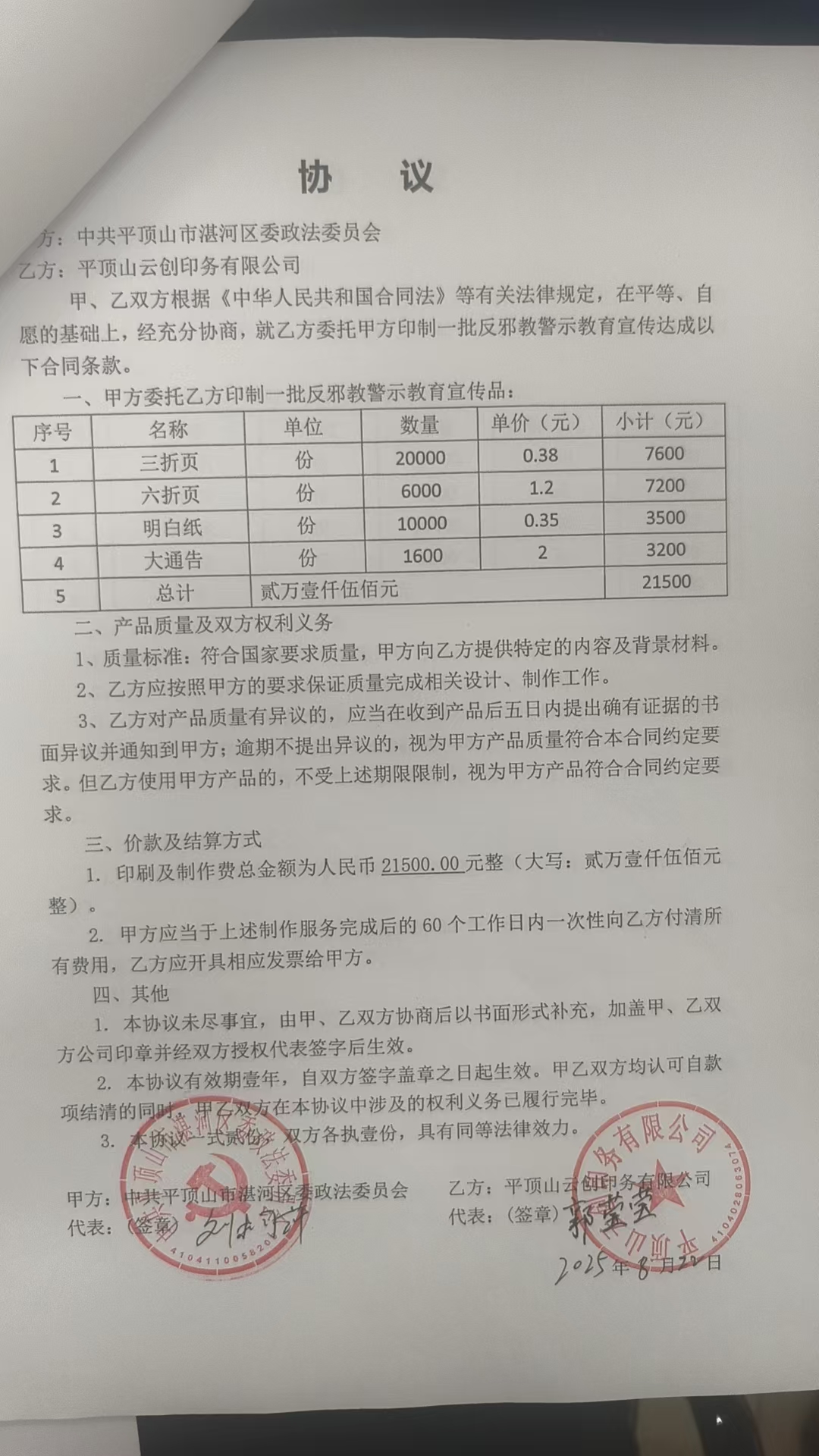 | 二、合同名称:公务印刷 | ||||||||||||