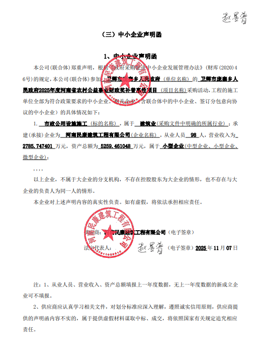 卫辉市庞寨乡人民政府2025年度河南省农村公益事业财政奖补普惠性项目-成交公告