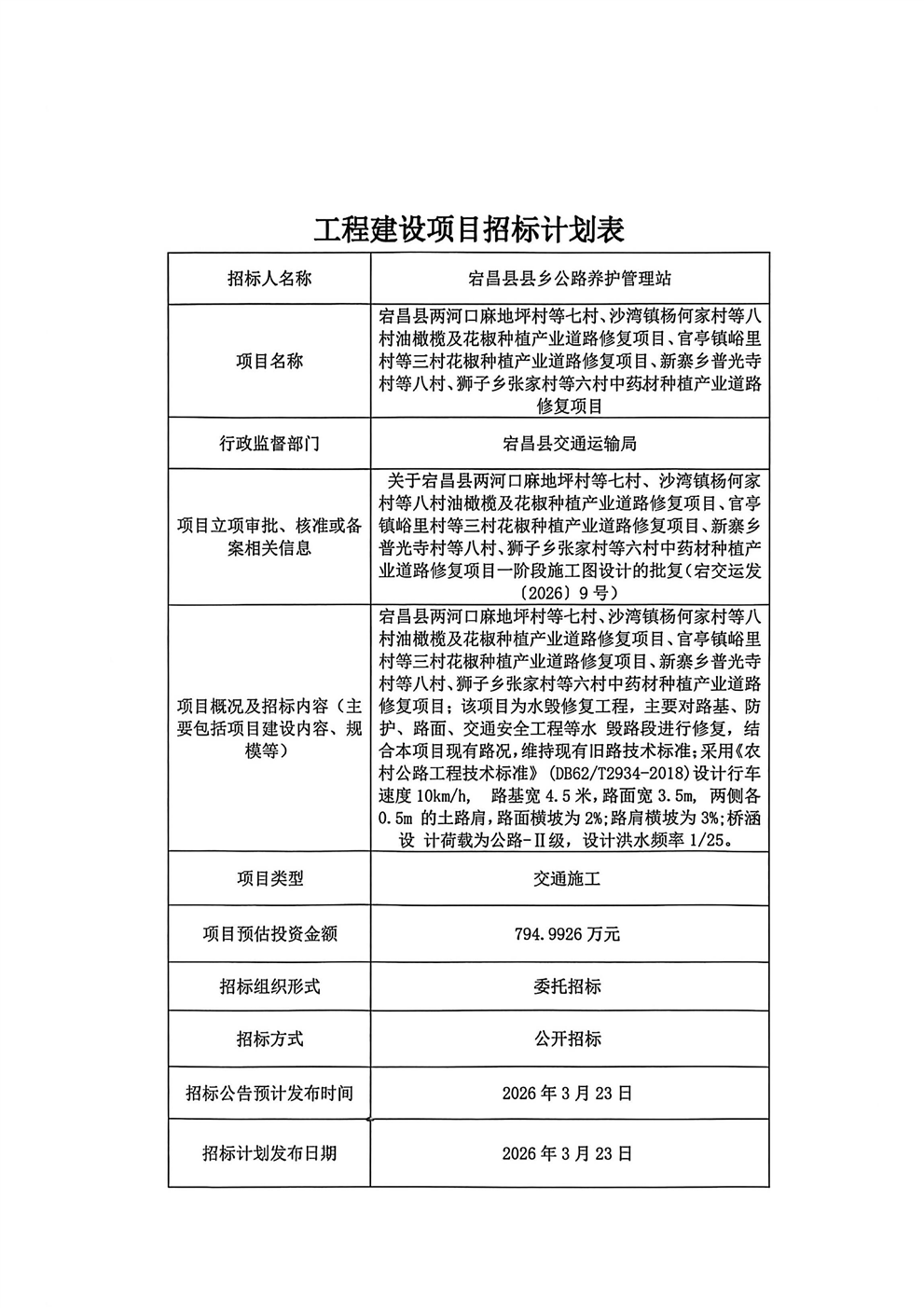 宕昌县两河口麻地坪村等七村、沙湾镇杨何家村等八村油橄榄及花椒种植产业道路修复项目、官亭镇峪里村等三村花椒种植产业道路修复项目、新寨乡普光寺村等八村、狮子乡张家村等六村中药材种植产业道路修复项目