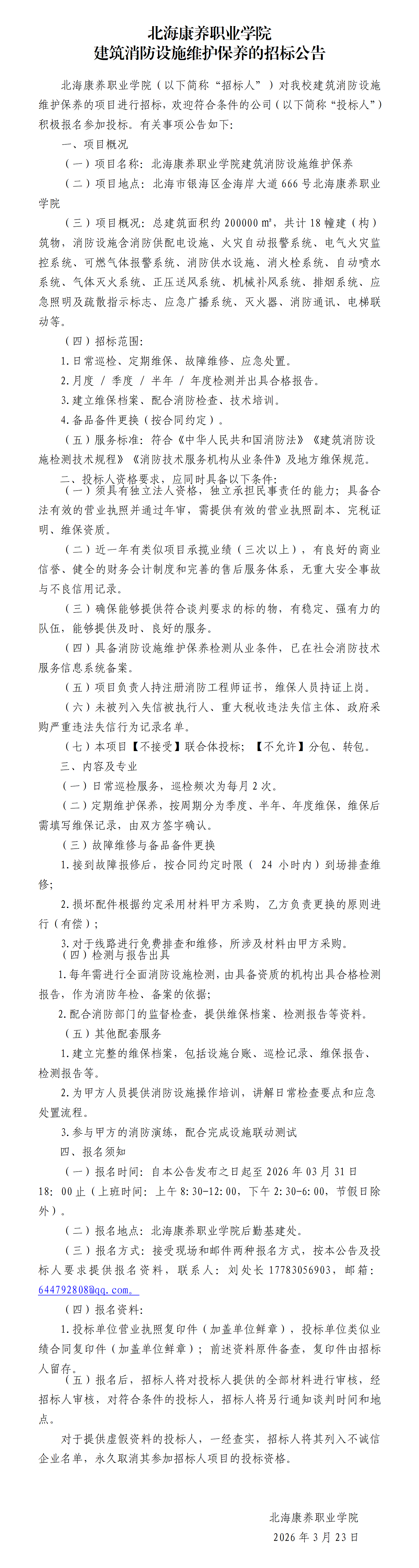 北海康养职业学院建筑消防设施维护保养的招标公告