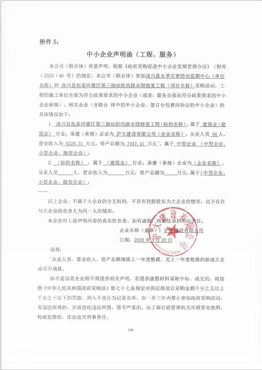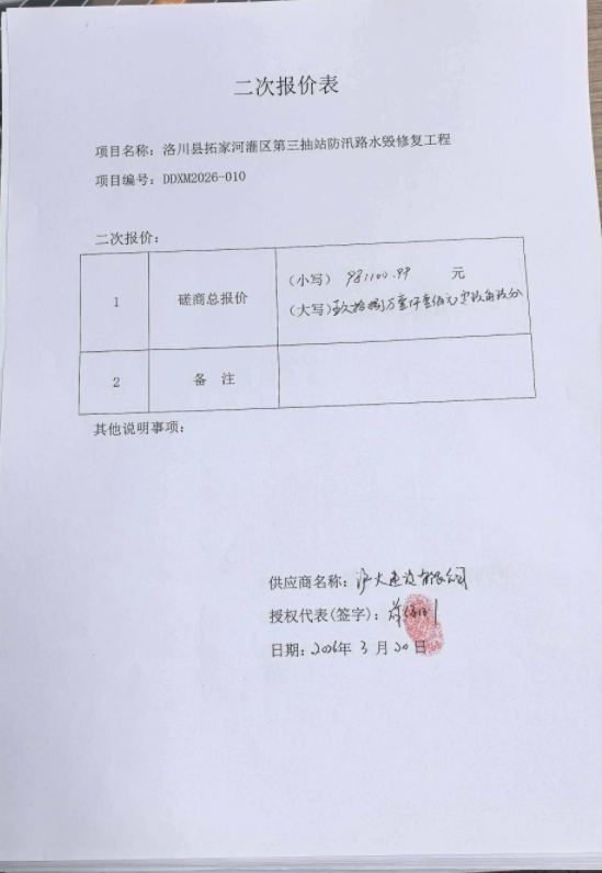 洛川县水旱灾害防治监测中心洛川县拓家河灌区第三抽站防汛路水毁修复工程中标(成交)结果公告