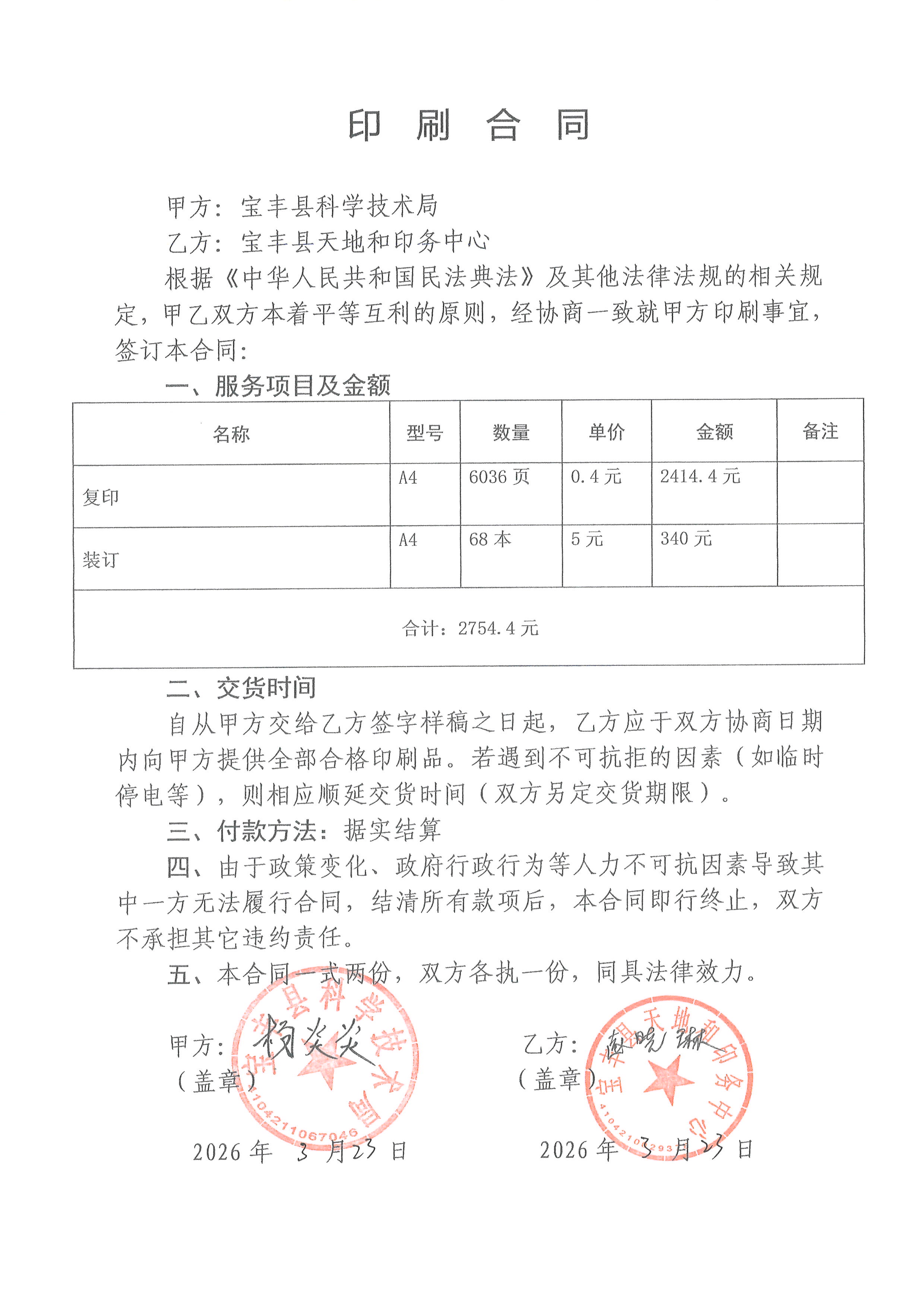 | *.供应商(乙方):宝丰县天地和印务中心 | ||||||||||||