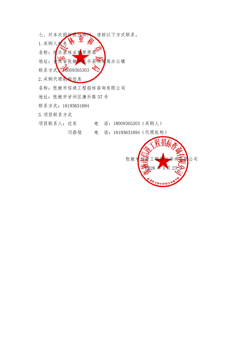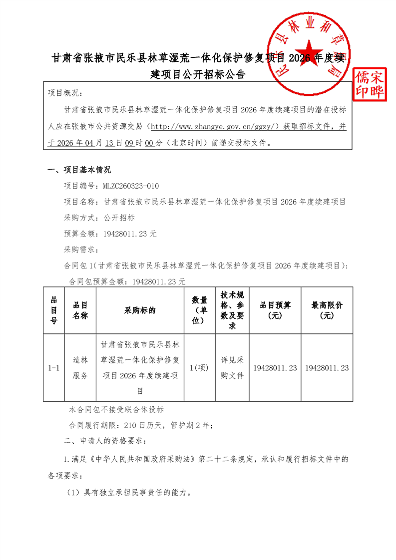 甘肃省张掖市民乐县林草湿荒一体化保护修复项目2026年度续建项目公开招标公告[采购/资审公告]