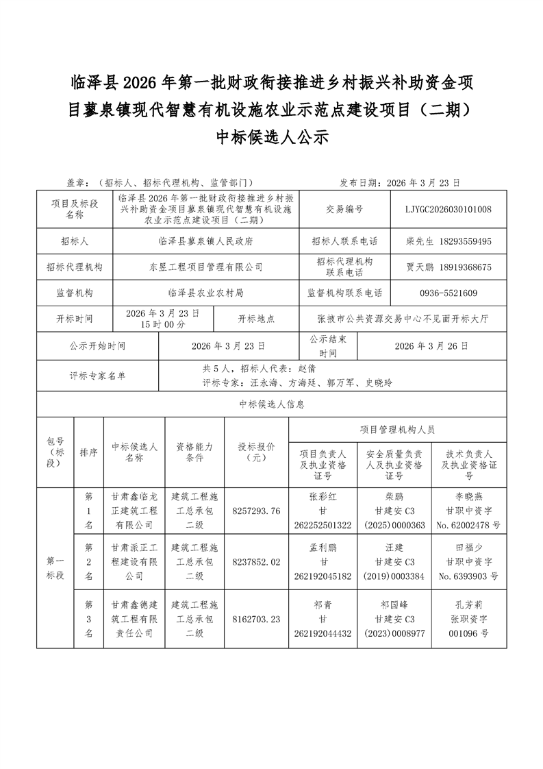 [临泽县]临泽县2026年第一批财政衔接推进乡村振兴补助资金项目蓼泉镇现代智慧有机设施农业示范点建设项目(二期)中标候选人公示[交易结果公示]