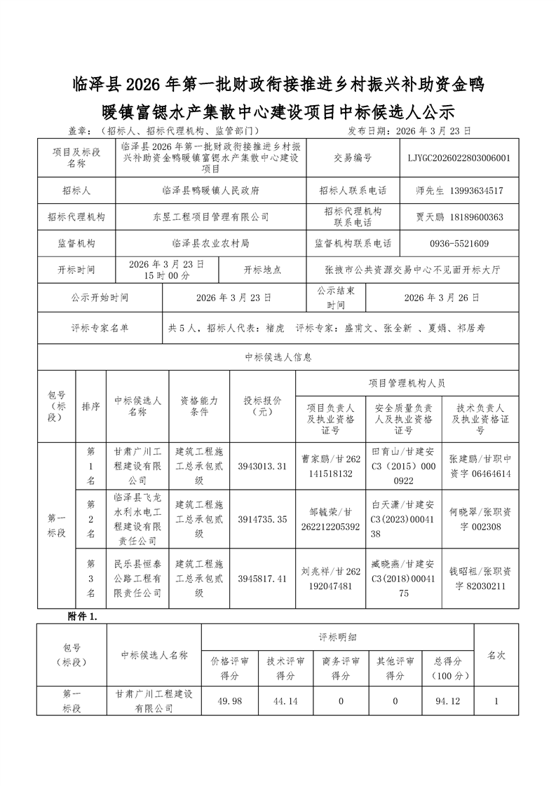 [临泽县]临泽县2026年第一批财政衔接推进乡村振兴补助资金鸭暖镇富锶水产集散中心建设项目中标候选人公示[交易结果公示]