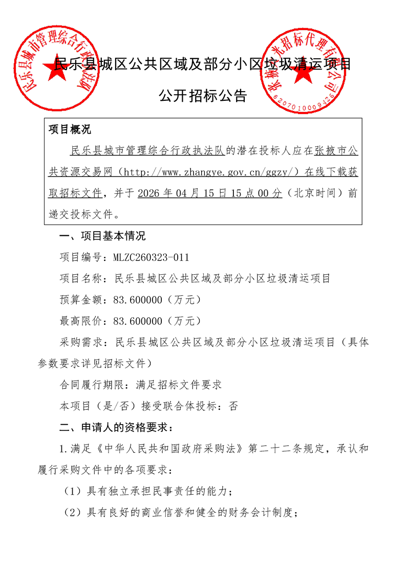 民乐县城区公共区城及部分小区垃圾清运项目公开招标公告[采购/资审公告]