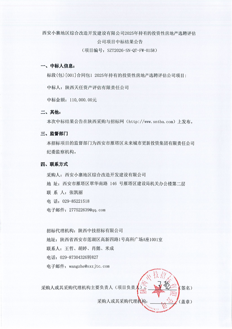 西安小寨地区综合改造开发建设有限公司2025年持有的投资性房地产选聘评估公司项目中标结果公告